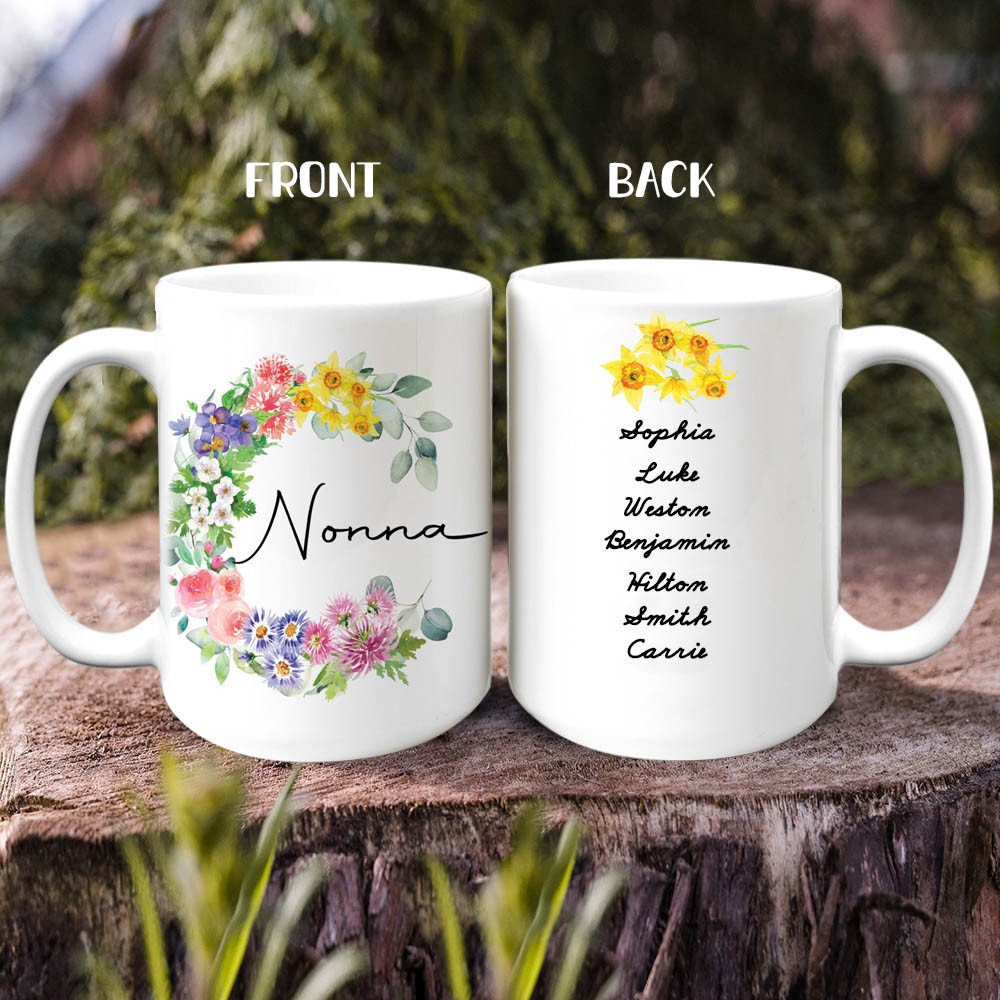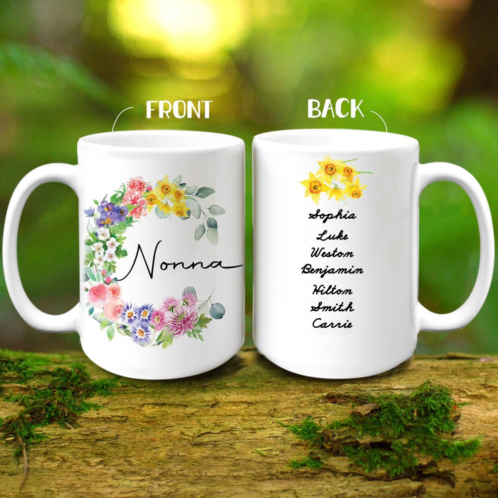 Personalized Birth Flower Mug With Grandchildren Names for Grandma / Nanny / Nana / Mom